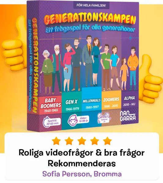 Sällskapsspelet som går att spela med alla åldrar. Många svenska frågor + roliga klassiska klipp med vår medföljande app. Perfekt för morföräldrarna & tonåringarna. Uppdaterad 2024 version, nu med 5 generationskort! Slutsåld två år i rad!
